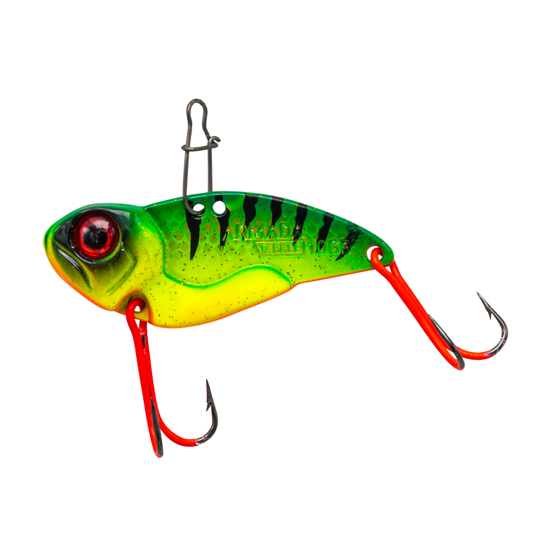 Armada Compact Vibrator 15g Firetiger är ett långkastande vibrationsbete som vi använder för att söka och finna abborre på större ytor.
