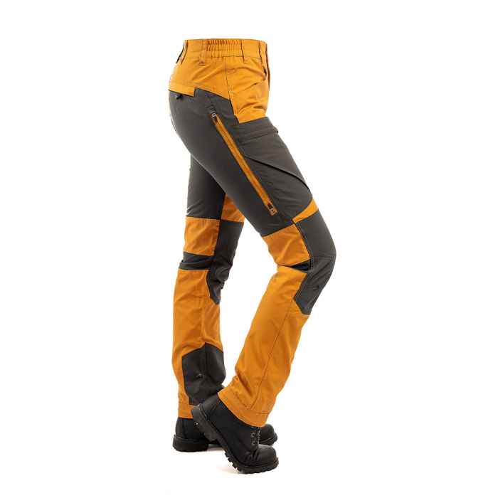 På knä, knäveck och rumpa är byxan i DWR behandlad 4-vägsstretch, vilket gör byxan extremt följsam. Nertill är byxan förstärkt och med justerbart benslut och men kängkrok så den sitter perfekt runt kängan. På båda låren är det öppningsbara ventilationshål med mesh. Byxan är försedd med 5 fickor. En bak med dragkedja, två benfickor och två lårfickor med dragkedja.