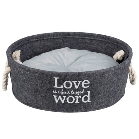 Bädd med dekorativt tryck: "Love is a four legged word". Tillverkad i filttyg (polyester). Stabil form tack vare förstärkt kant. Isolerande och smutsavvisande. Quiltad kudde med plyschöverdrag och polyesterfyllning. Dekorativa handtag i tvinnat bomullstyg. Färg: Grå. Bädden bör handtvättas.