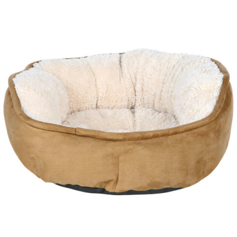 Rund mjuk bädd med mocka-look. Foder av plysch. Bädden är stoppad med polyester fleece fyllning. Uttagbar kudde. Lättskött nylonbotten. Färg: Brun/beige.