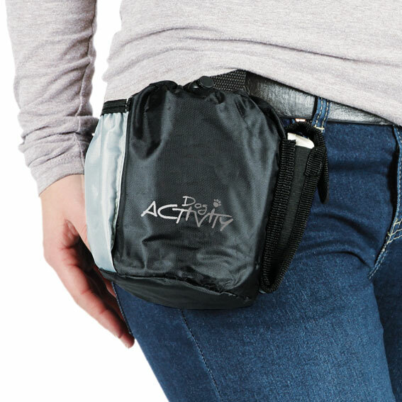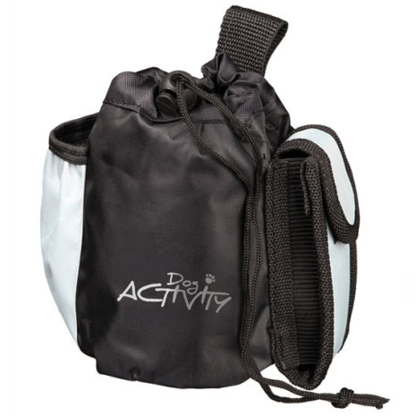 Godisväska tillverkad av nylon/polyester. Väskan är enkel att öppna och stänga med dragsko. Med axelsnöre (som går att ta bort), ytterficka med blixtlås, sidoficka och mobilficka finns. Kardborreflik för att fästa i bälte. Lätt att rengöra. Storlek: ø 10 x 15 cm. Färg: Svart/grå.