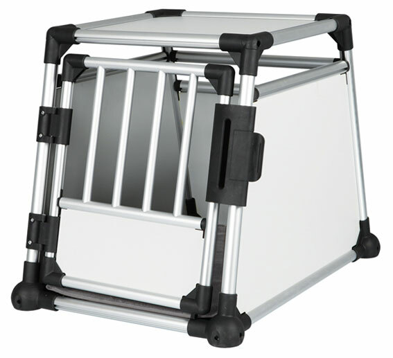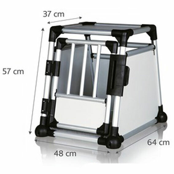 Hundbur i aluminium. Hög kvalitét, säker och väldigt tystlåten i bilen. Sluttande sidor som gör att den passar i de flesta bilar. Säkerhetslås på dörren. Anti-glid i botten och många ventilationshål för bra luftcirkulation.
