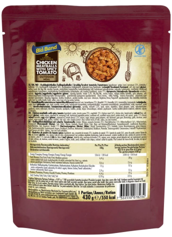 Hem » Vildmark » Äta ute » Turmat » Blå Band Mjukkonserv Kyklingköttbullar med kryddig tomatsås