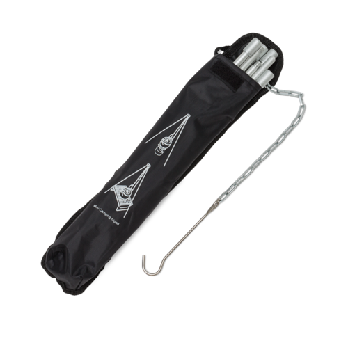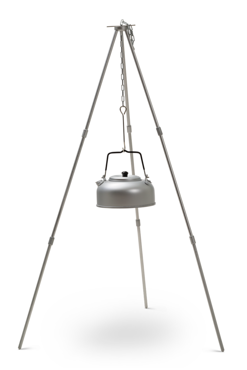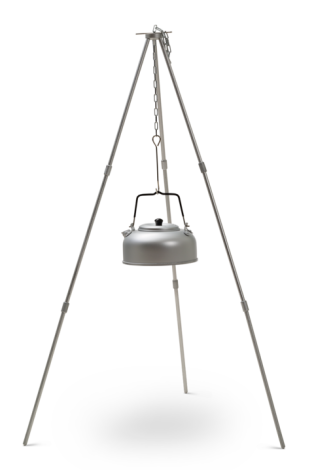 Eldstativets tre ben står stadigt uppfällda med en krok i mitten.