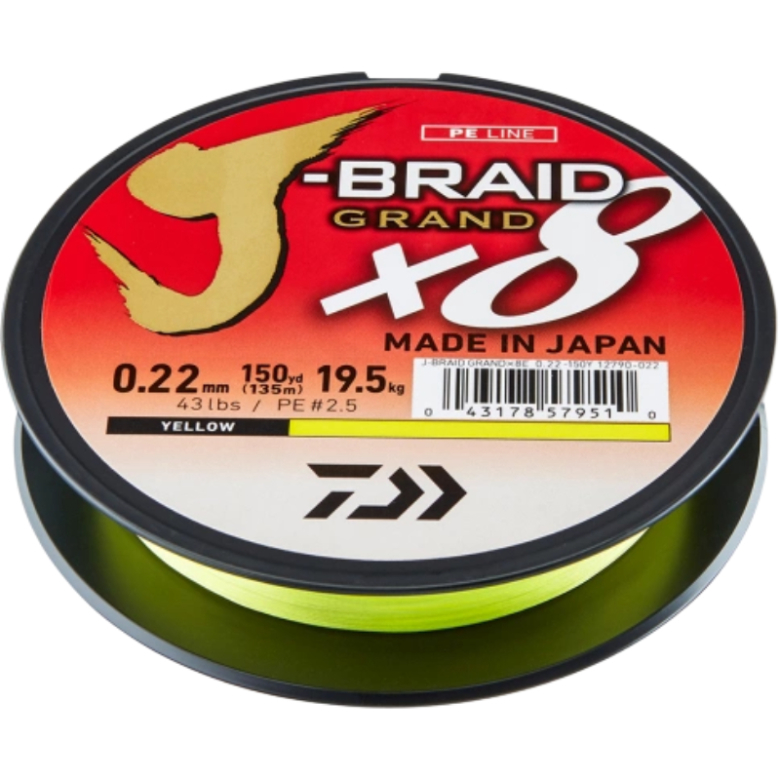 Jämfört med den etablerade J-Braid har Grand modellen en något tightare braid, vilket resulterar i högre nötningsbeständighet samt förbättrad knutstyrka. Genom en speciell tillverkningsprocess, där J-Braid Grand sträcker sig, ökas nötningsmotståndet och den linjära styrkan ytterligare. J-Braid Grand är mycket smidig och något tystare. Eftersom denna lina är något styvare än J-Braid, är den speciellt tillämpbar vid blåsiga och svåra fiskeförhållanden.