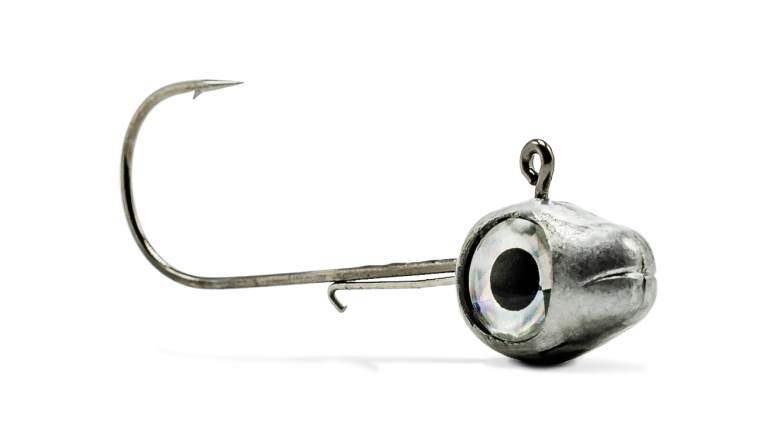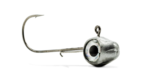 EyeCu jiggskalle är utrustad med en sylvass Mustad 32627 krok och ett stort öga för att attrahera fisken till hugg.