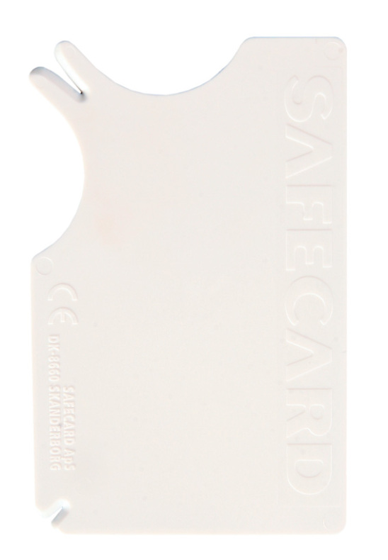 Safecard fästingborttagare. Tillverkad av plast i form av ett kreditkort, lätt att ha med sig i plånboken. Funktion för enkel borttagning av fästingar. Har även en liten skåra för borttagning av stickor eller andra vassa föremål. Storlek: 8x5cm.