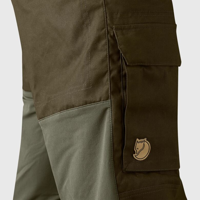 Fjällräven Drev Byxor - Deep Forest är en bekväm byxa i tålig G-1000 Silent med stretchpaneler. Vattentät förstärkning på bak och knän, fyra fickor, justering i benslut och kängkrok.
