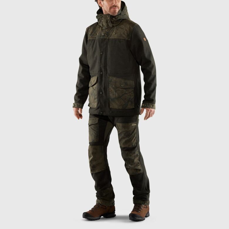 Fjällräven Värmland Wool Jacket är en slitstark, väderavvisande jaktjacka i återvunnen ull och G-1000 Silent Eco.