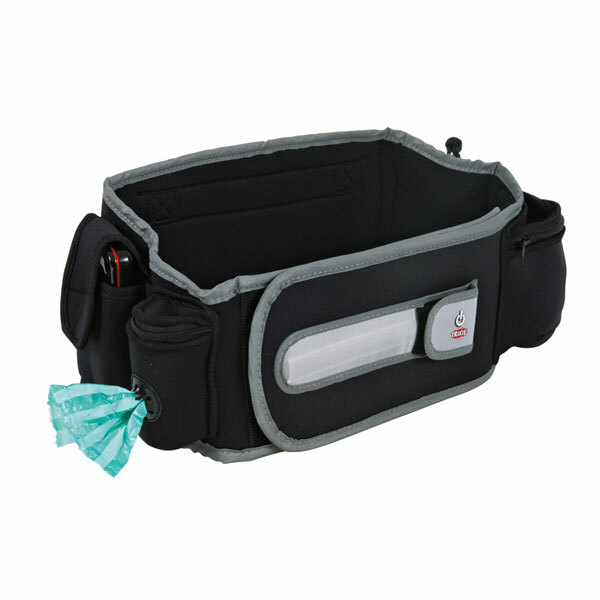 Praktisk midjeväska, Flashbälte "Active". Ett praktiskt bälte som låter dig ha händerna fria. Lätt och bekväm att bära. Gjord av slitstarkt material. Fyra fickor för förvaring av nycklar, hundgodis, mobiltelefon och bajspåsar. Reflekterande lampa som både lyser och blinkar med batteritid upp till 100 timmar i blinkande läge och 50 timmar i lysande läge.