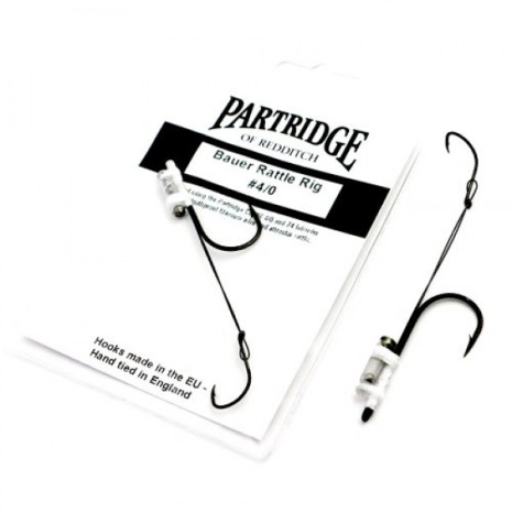 Bauer Pike Rig Rattle Färdiga gäddriggar till dina gäddtubflugor. Dessa gäddriggar är framtagna av Niklaus Bauer tillsammans med den anrika kroktillverkaren Partridge för att få fram en optimal rigg till gäddflugfisket. Riggen är bunden på korken Partridge CS86 4/0 och med en titaniumwire med en Partridge Z4 Intruderkrok som stinger. Ovan på sitter en Bauer Power Rattle. För att ge det karikmatiska "klick" ljudet.