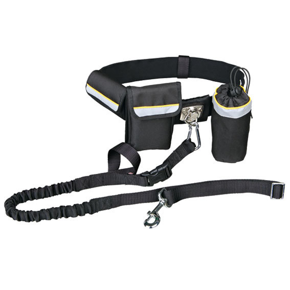 Elastiskt hands-freebälte med fickor för mobil, godis, vattenflaska etc. Handögla för vanliga promenader. Fullt justerbart koppel. Speciellt användbar vid promenader, jogging eller stavgång. Det elastiska bältet ger bättre säkerhet. Passar hundar upp till 40 kg.