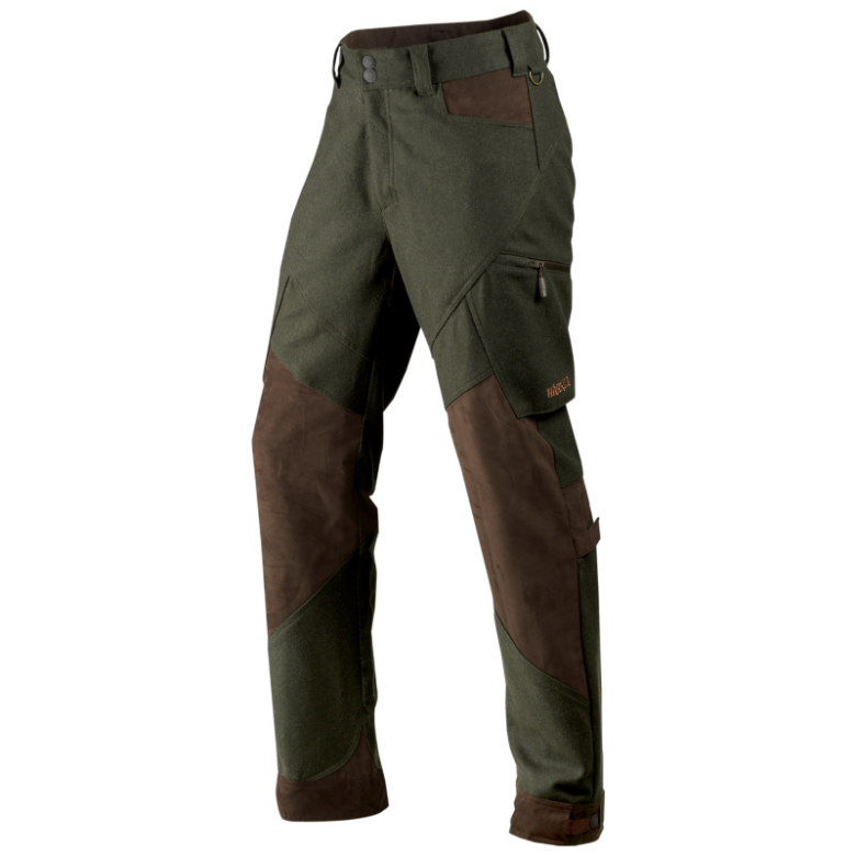 Metso Active-byxorna är liksom Metso Active-jackan tillverkade i en filtad ullblandning av 50 % ull och 50 % polyester. Det gör byxorna slitstarka, temperaturreglerande och ventilerande. Materialet har dessutom fått en behandling med Bionic Finish® som förstärker ullens naturliga vatten- och smutsavvisande egenskaper. Byxorna är förstärkta på de mest utsatta ställena, som benslut, knän, ficköppningar och säte, med slitstark mockaimitation och ett vattentätt membran. Byxorna har två fickor fram samt två benfickor med dragkedja, och den högra benfickan har en insydd patronhållare. Dessutom har byxorna justeringsremmar i bensluten och bakom knäna. Det gör det möjligt att få mer utrymme runt knät, vilket är praktiskt när jakten kräver stor rörelsefrihet. Metso Active-byxorna har förhöjd midja bak, så att inte kläderna glipar när du sitter eller böjer dig ner. På vänster sida av linningen har byxorna en D-ring för att fästa olika slags utrustning.