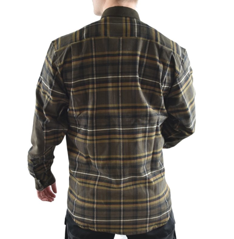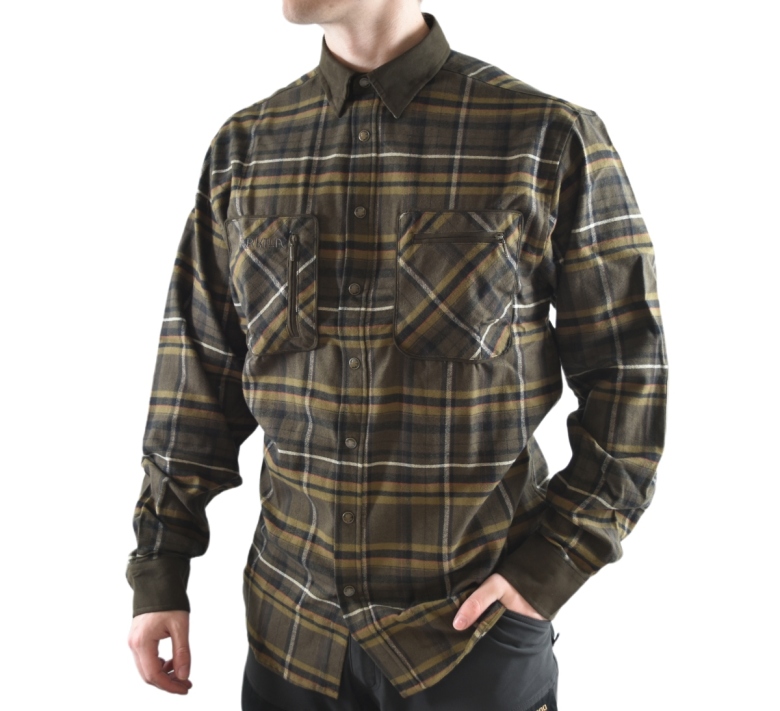 Pajala Skjorta från Härkila är en rutig skjorta i klassisk modell med armbågslappar, krage och manschetter i mockaimitation. Skjortan har två bröstfickor med praktisk dragkedja och är detaljerad med tryckknappar framtill.