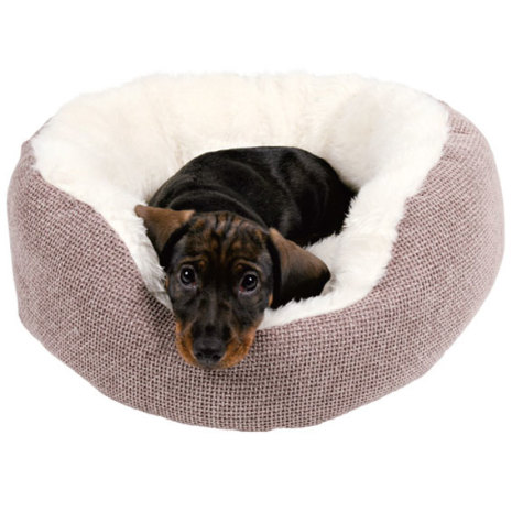 Rund mysig hund- och kattbädd i vävt tyg. Tillverkad med ett poyester täck, polyester fleece fyllning och en lättskött botten i nylon.