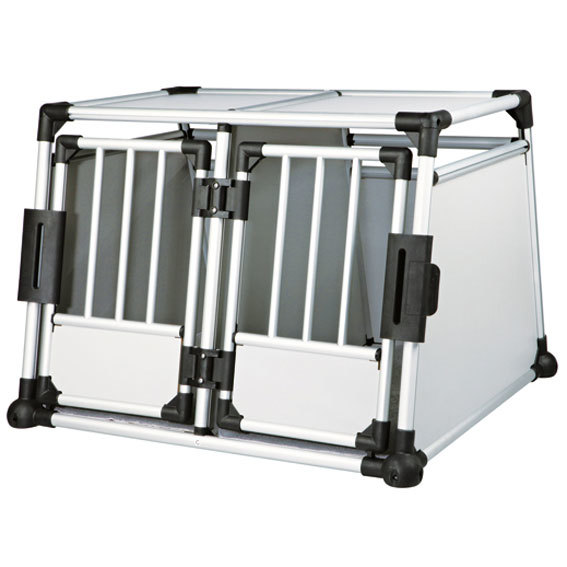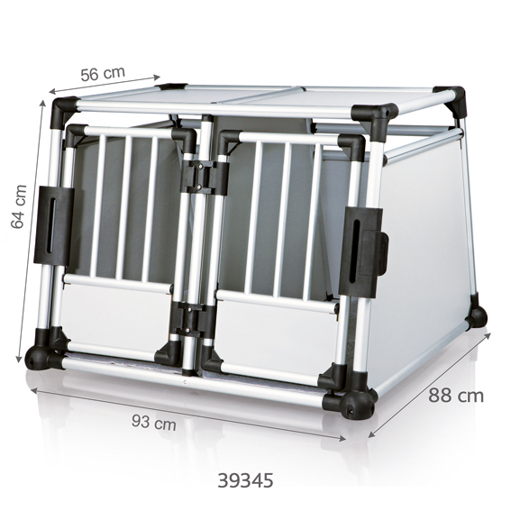 Dubbel bilbur i aluminium. Hög kvalitét, säker och väldigt tystlåten i bilen. Sluttande sidor som gör att den passar i de flesta bilar. Säkerhetslås på dörren. Anti-glid i botten och många ventilationshål för bra luftcirkulation. Mått: 93xh64x88 cm