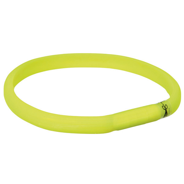 Uppladdningsbart lysande hundhalsband med USB-kabel. Limegrön. Kan både blinka och lysa (ca.4 timmars blinkande ljus och 2,5 timmars kontinuerligt ljus). USB-kabel ingår. Tillverkad av silikon. Stänksäker. Kan enkelt klippas till en mindre storlek.