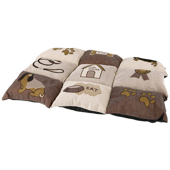 Mysig hundbädd tillverkad av av mikrofiber/polyester och polyesterfyllning. Lapptäcket är dekorerad med insydda hundmotiv, ben och tassar. Hög kvalité och hållbar. Ger en varm och mjuk plats på kalla och hård golv. Perfekt dyna i plastbädd och transportbur. Halkfri botten. Storlek: 55×40 cm. Färg: Brun/Beige.
