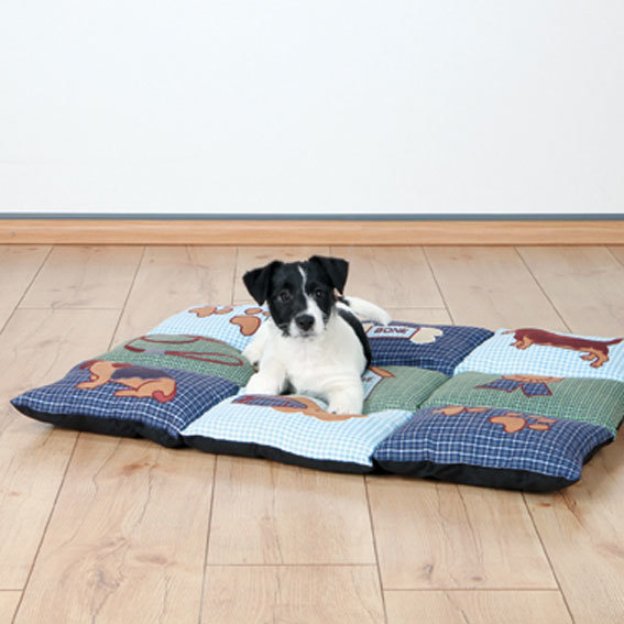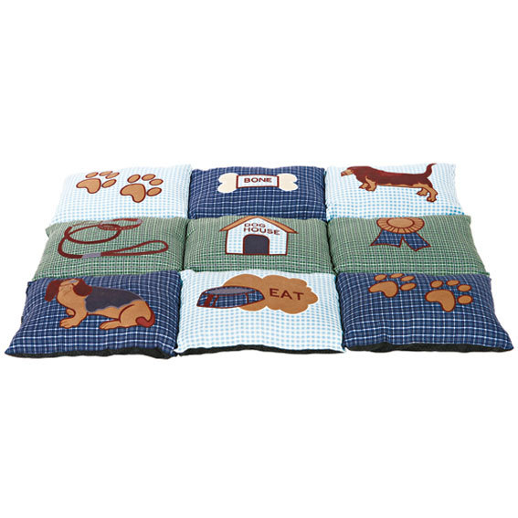 Vadderat och mjukt lapptäcke i mikrofiber och polyester. Dekorerad med hundmotiv och tassar. Varmt och mjukt på kalla och hård golv. Halkfri botten. Storlek: 80×55 cm. Färg: Blå/grön.