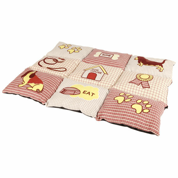 Vadderat och mjukt lapptäcke i mikrofiber och polyester. Dekorerad med hundmotiv och tassar. Varm och mjuk på hårda kalla golv. Halkfri botten. Storlek: 80x55 cm. Färg: Röd/beige.