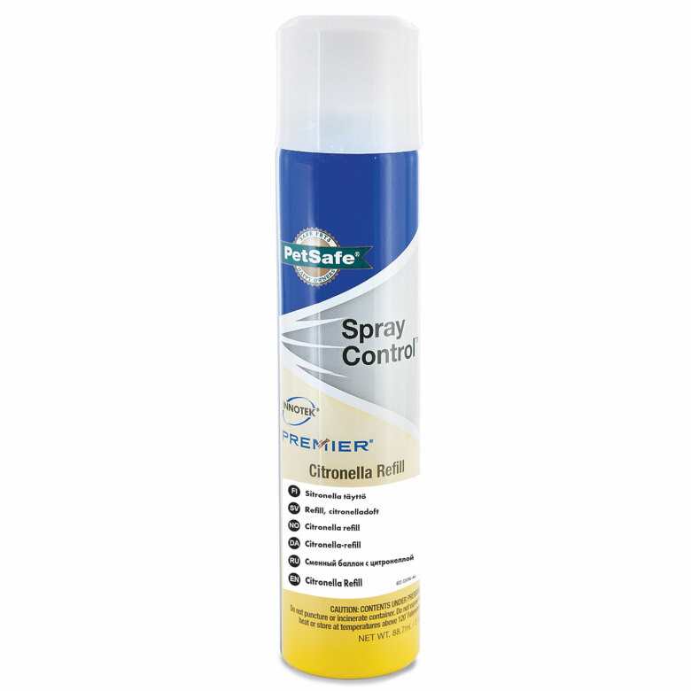 PetSafe Spray Refill påfyllningsflaska till PetSafe antiskallhalsband för hund med citrondoft. Refillspray med citrondoft som fungerar med alla PetSafe sprayhalsband som sprayar hundens nos med en lätt dusch när den skäller. Det bryter skallbeteendet och hjälper dig att träna bort oönskat skällande. En flaska PetSafe Spray Refill räcker till påfyllning av 300-400 sprayduschar. Sprayen lämnar inga fläckar och är miljövänlig.