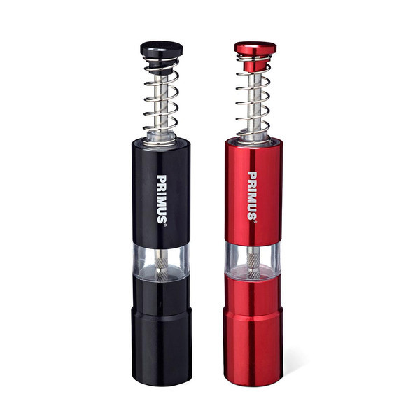 Två slagtåliga aluminiumkvarnar för salt och peppar. De är enkla att fylla på och lätta att använda med en hand. 15 centimeter höga.