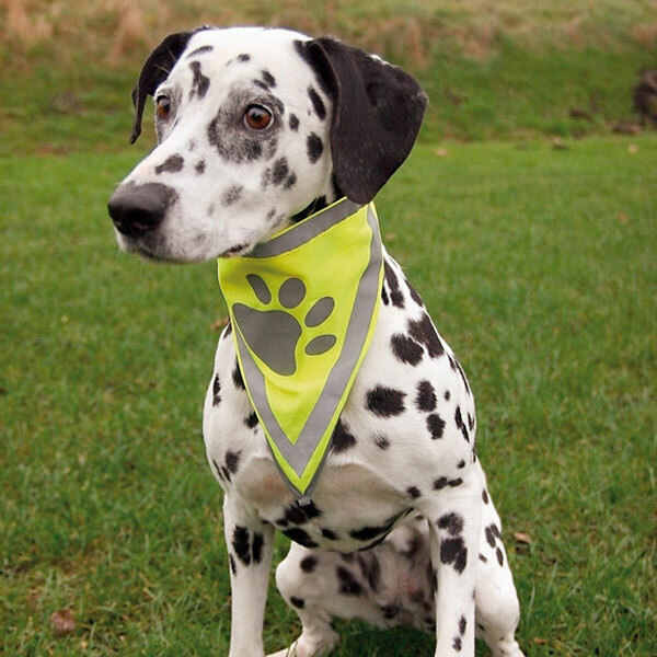 Säkerhetsscarf som passar de flesta hundar och som är bra att ha på promenad under den mörka årstiden. Reflekterande rand och ett tassavtryck. Fästes enkelt med kardborre.