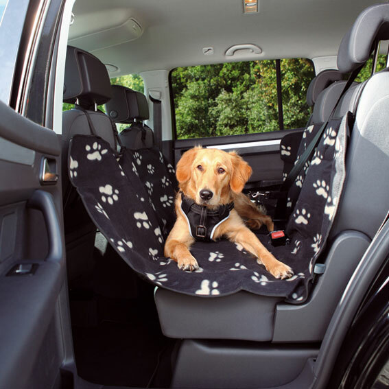Sätesskydd för baksätet. Skyddar mot smuts och djurhår. Bältes slitsar gör det möjligt att spänna fast hunden. Tillverkad i hållbart nylon. Platsbesparande förvaring med två fickor. Enkel montering och demontering. Färg: Svart/beige och motiv av "tassar".
