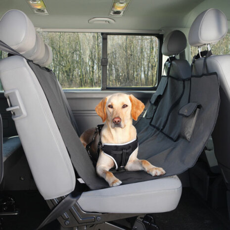 Sätesskydd för baksätet. Skyddar mot smuts och djurhår. Bältes slitsar gör det möjligt att spänna fast hunden. Särskilt hållbart, tillverkat i nylon. Platsbesparande förvaring med två fickor. Enkel montering och demontering. Storlek: 1.40 × 1.45 m. Färg: Svart/brun.