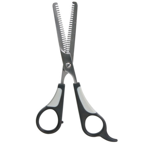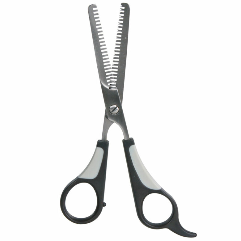Dubbelsidig effileringssax i metall för hundar, katter och smådjur. För tovutredning och urtunning. Plasthandtag med halkfritt gummigrepp. Längd: 18,5 cm.