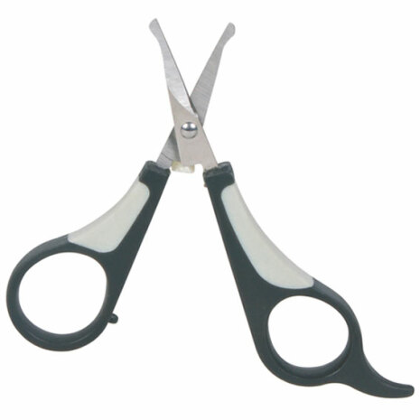 Sax med rundade ändar, lämplig när man trimmar kring öron och tassar. Plasthandtag med halkfritt gummigrepp. Längd: 9,5 cm.