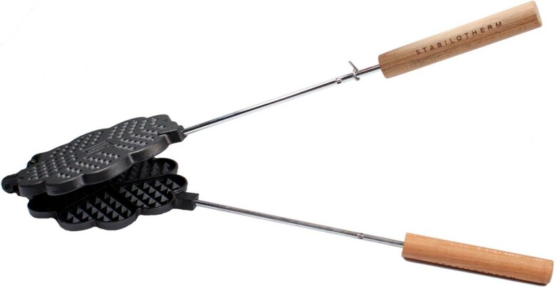 Rejält våffeljärn i gjutjärn från Stabilotherm. Våffeljärnet har ett trähandtag och långa skaft för att du ska kunna tillaga dina våfflor över öppen eld på säkert avstånd. Järnet gräddar normalstora våfflor som kan delas i fem mindre våffelhjärtan.