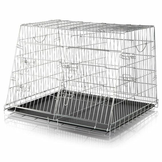Tvådelad stålbur för transport av två hundar. Tillverkad av galvaniserat stål. Avtagbar avdelare, två dörrar och uttagbart plastgolv. Optimalt utnyttjande av bilens bagageutrymmet på grund av lutande sidor. Hopfällbar och utrymmesbesparande förvaring. Storlek: 93xh68x79 cm.