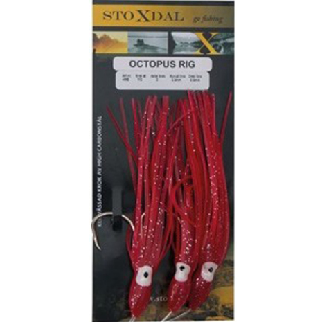 Stoxdal Octopus Rig är en upphängare i bläckfiskimitation med krokar i storlek 7/0 - färdigknutet tackel redo för havsfiske. Stoxdal Octopus Rig har 3 st bläckfiskar på upphängartacklet, dessa är fästa på enkelkrokar i storlek 7/0. Tacklet är knutet av nylonlina i dimension 0,90 mm och håller bra. Ett tips är att byta ut beteslåset till ett extra stryktåligt om du fiskar efter stor fisk! Dessa upphängare brukar vara riktigt bra på torsk, sej, bleka och de flesta havsfiskar.