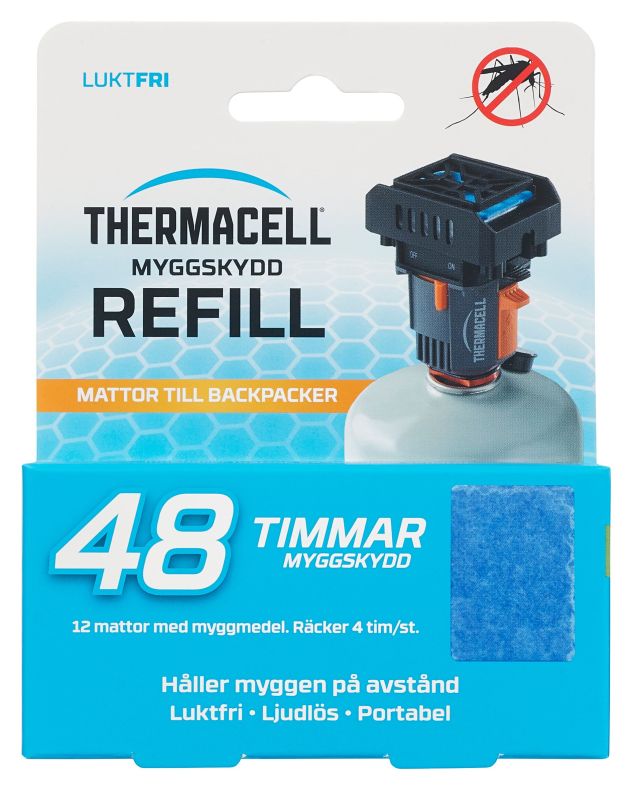 Refillprodukt för Thermacell Backpacker. Paketet innehåller 12st myggmedelsmattor för skydd i upp till 48 timmar. Innehåller ej några gaspatroner då Backpacker drivs av friluftsgasbehållare.