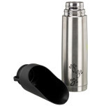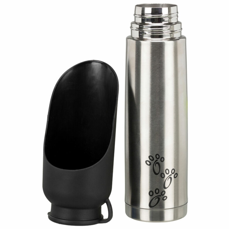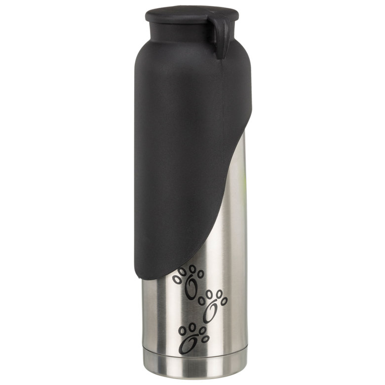 Thermoflaska i rostfritt stål och plast. Rymmer 500 ml. Lockets form gör locket lämplig som vattenskål. Håller temperaturen på dricksvattnet varmt eller svalt i 6-8 timmar. Färg: Svart/Silver.
