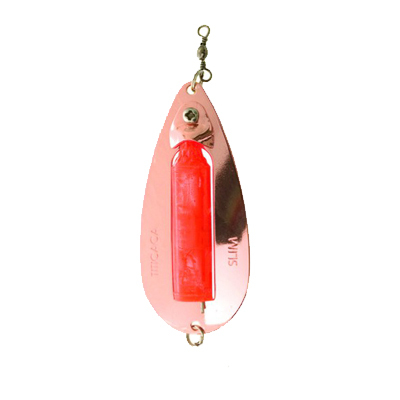 Titicaca Slim Blinkpirk är 80 mm lång och levereras med lekande, fjäderring, nylontafs och krok i storlek 8. Själva blänket är koppar och blinklampan är blå. Blinklampan kläms fast på blänket och börjar blinka vid kontakt av vatten. Du kan alltså byta ut blinklampan om du vill.