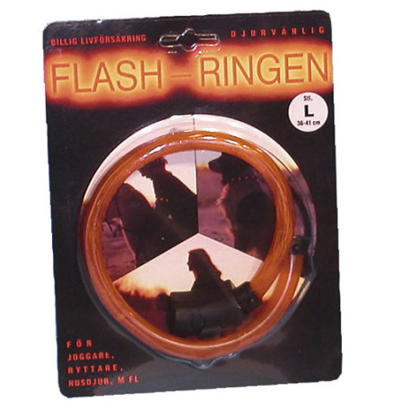 Flash-ringen kan användas på hund eller katt. Även användbar till ryttare och joggare. Den blinkar kontinuerligt i mer än 36 timmar, den tål vatten, har låg vikt och är lätt att justera. Levereras med batterier.
