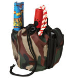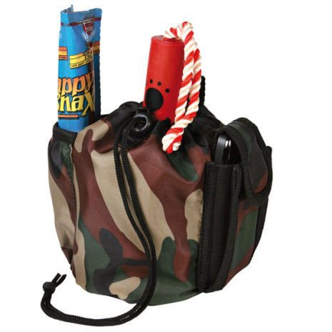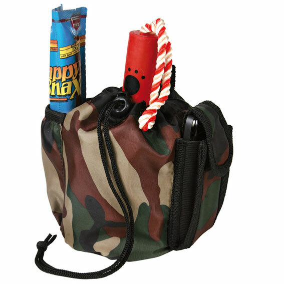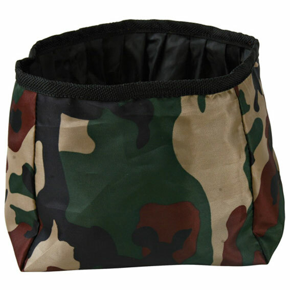 Set för utomhusvistelse. Vattentålig nylonväska, i camo med många fickor och axelrem. Hopfällbar vattenskål för resor 1,8 liter. Väska med reflexband för tillbehör, ring för t.ex. adresslapp.