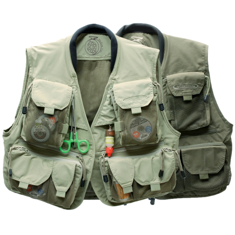 Vision Caribou är en fiskeväst med gott om fickor. De större fickorna har blixtlås medan övriga är försedda med kardborrelåsning. Materialet är av högkvalitetsnylonväv som är vattenavstötande. Axelpartiet har extra stoppning av ett specialmaterial som hjälper till att fördela vikten på ett bra sätt.